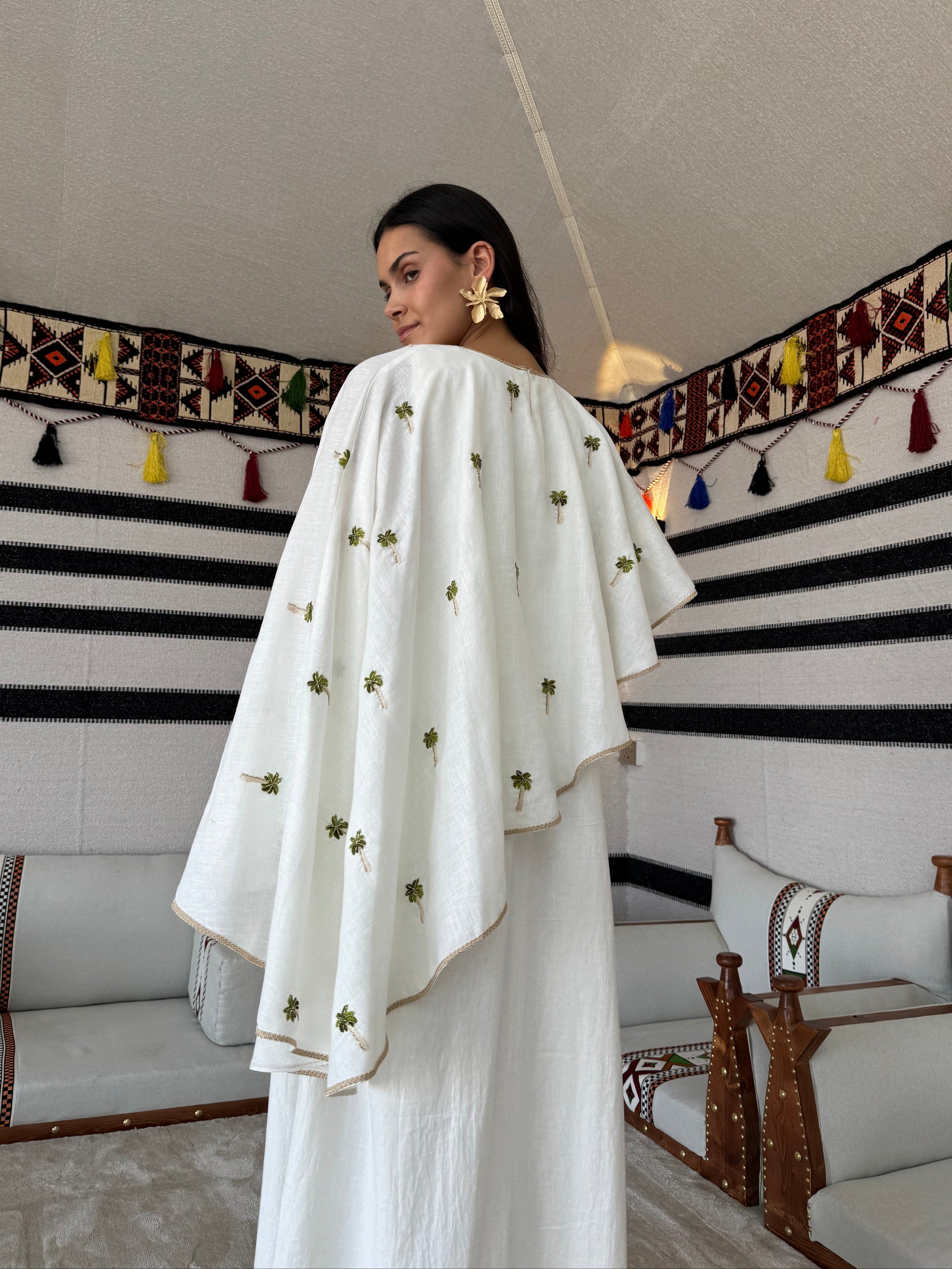 A linen kaftan featuring soft wavy sleeve detailing, adorned with palm embroidery and delicate beading, finished with refined trims.