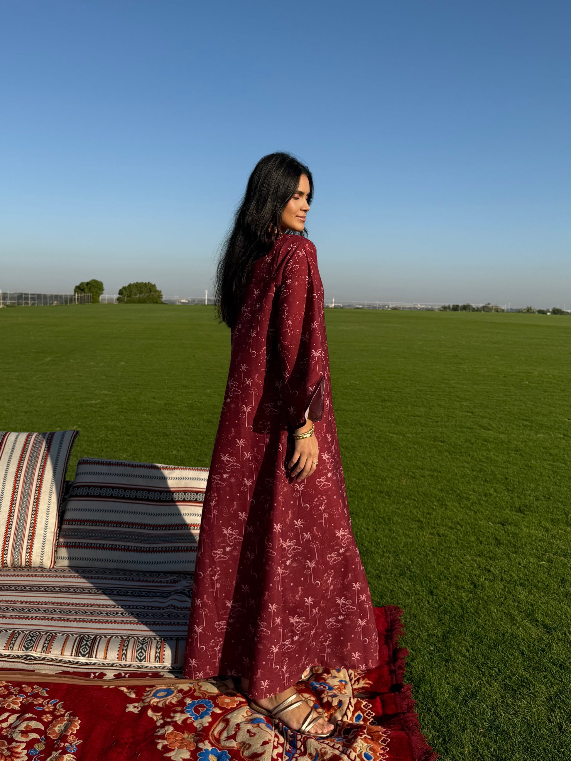 An airy printed linen abaya featuring refined lace trims and tassel details, cut in a loose, flowing shape for all-day comfort and ease.